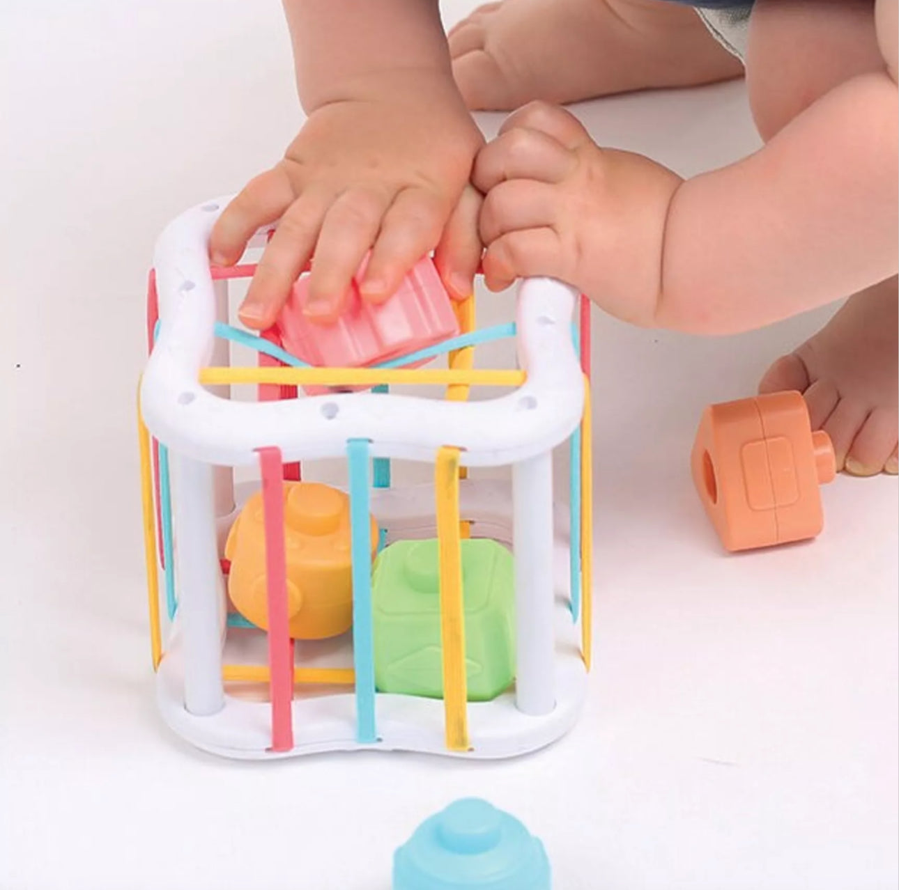 Les faces ouvertes du cube sont reliées par des élastiques tendus, sont très faciles à agripper. Les enfants travaillent leur dextérité et leur force pour faire entrer les 6 différentes formes à travers les élastiques.
