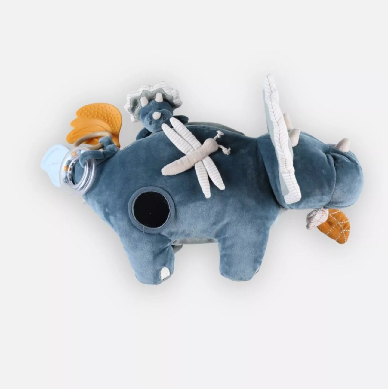 Ops, le sympathique dinosaure, propose de nombreuses activités : un hochet à perles multicolores, un miroir, des jouets de dentition pour soulager les poussées dentaires et du papier froissé.